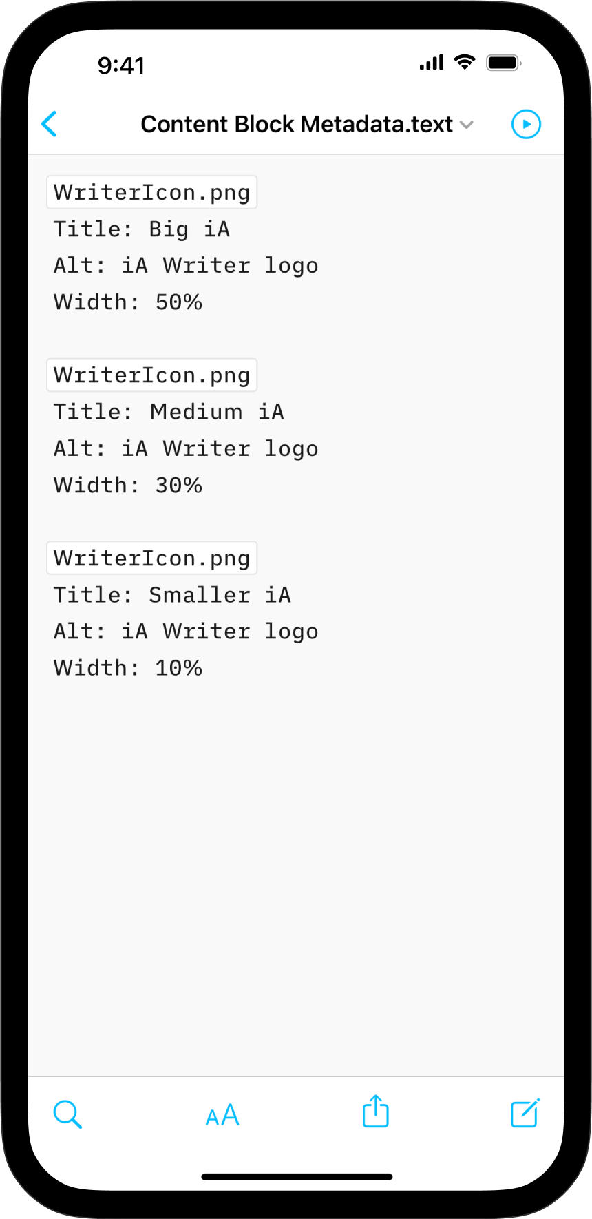In iA Writer for iPhone, you have the choice between three types of metadata, as follows: