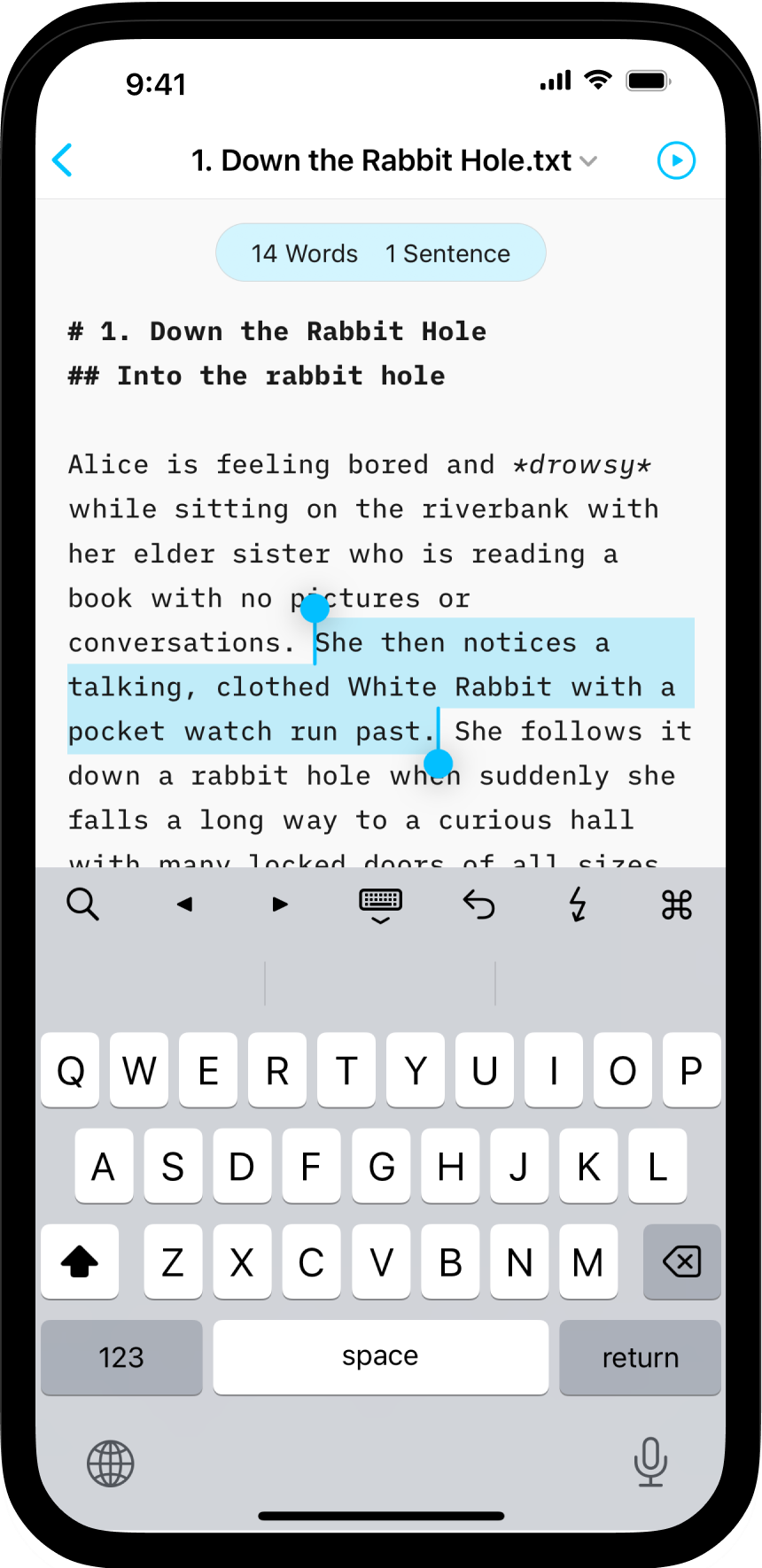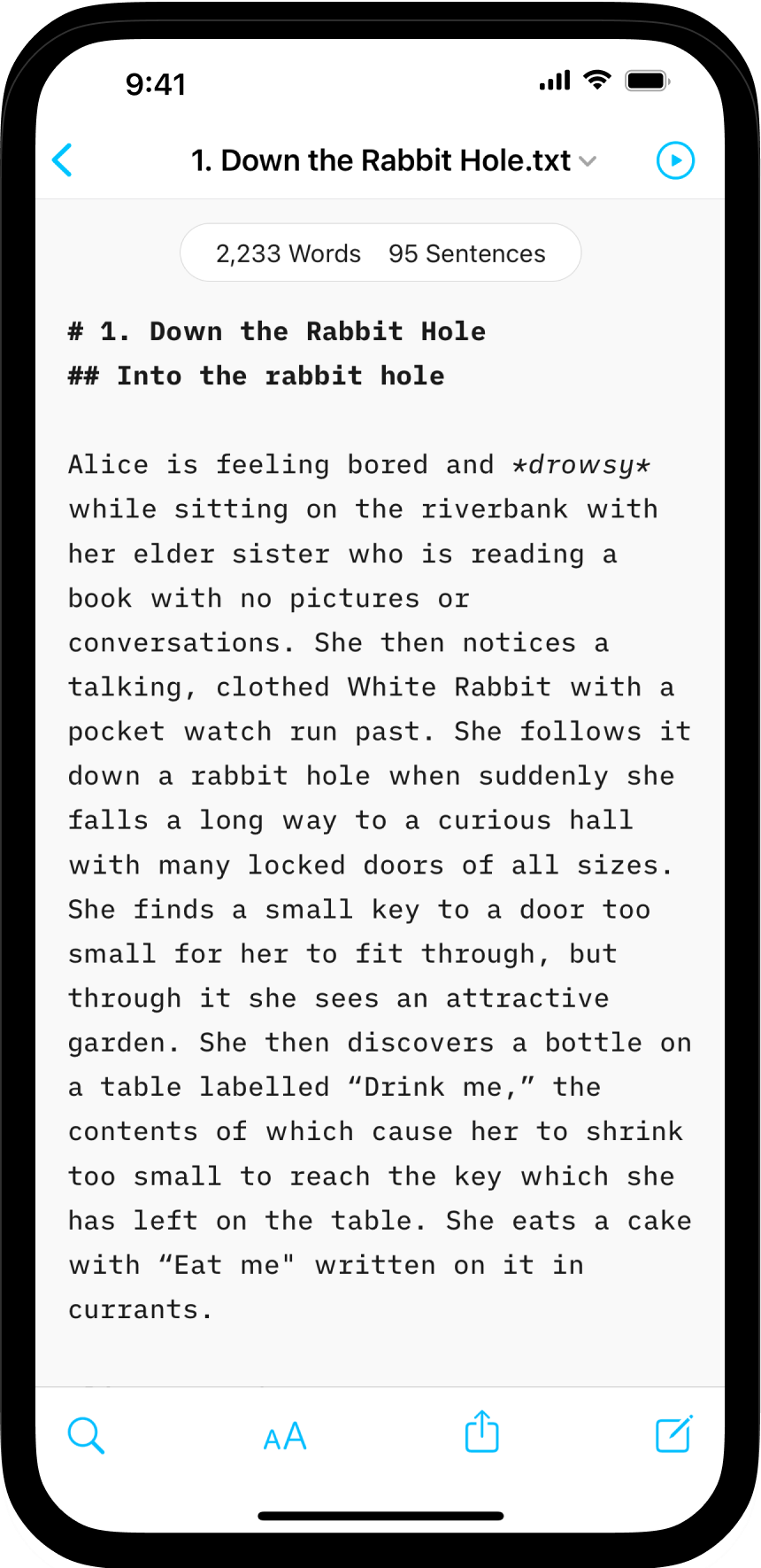iA Writer for iPhone provides comprehensive statistics on your document, including character, sentence or task counts, and estimated reading time.